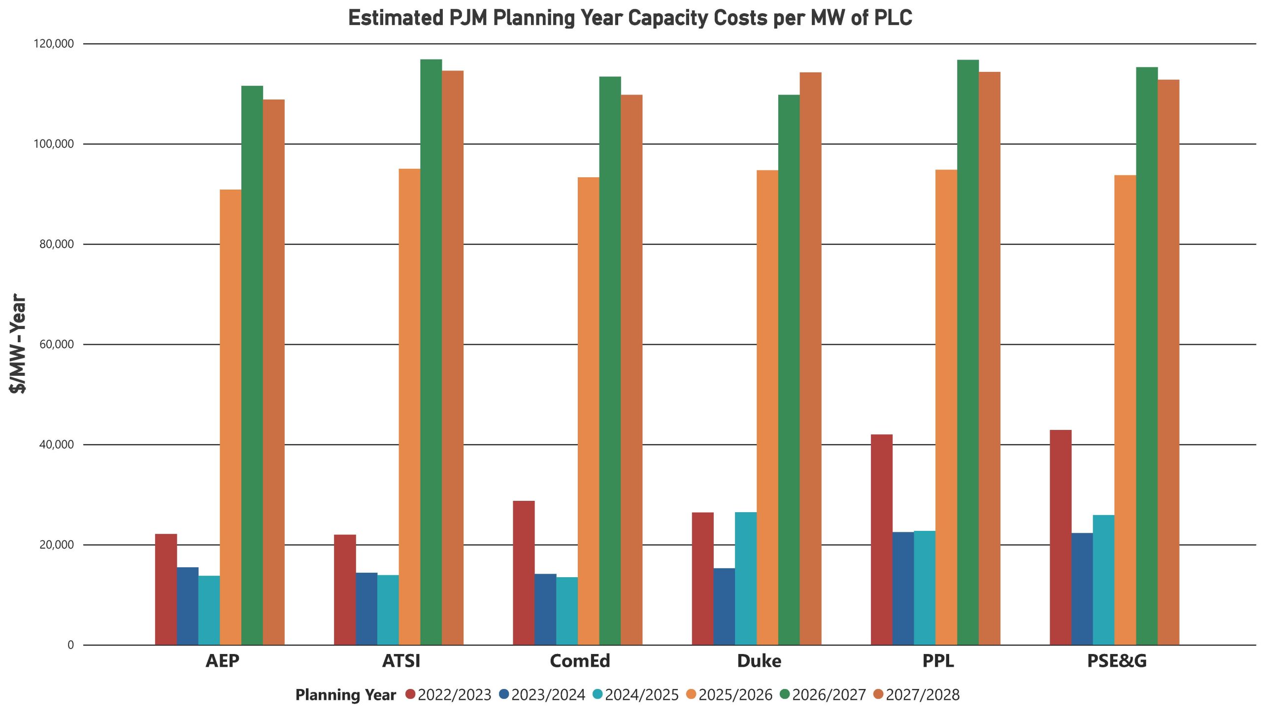 The graph below shows historical annual capacity rates as established via the PJM auction process for various utilities within the PJM system.